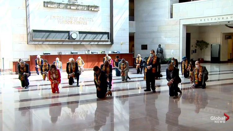 Спикер Палаты представителей Нэнси Пелоси и члены Конгресса от демократов почтили память афроамериканца Джорджа Флойда в Зале Эмансипации в Центре для посетителей Капитолия в Вашингтоне. Они простояли на одном колене 8 минут 46 секунд - столько полицейский придавливал коленом шею Флойда.