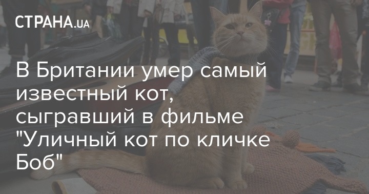В Великобритании скончался известный уличный кот Боб. После того как его подобрал лондонский музыкант Джеймс Боуэн, он стал героем (а также актером) популярной кинодрамы "Уличный кот по кличке Боб" и серии книг.