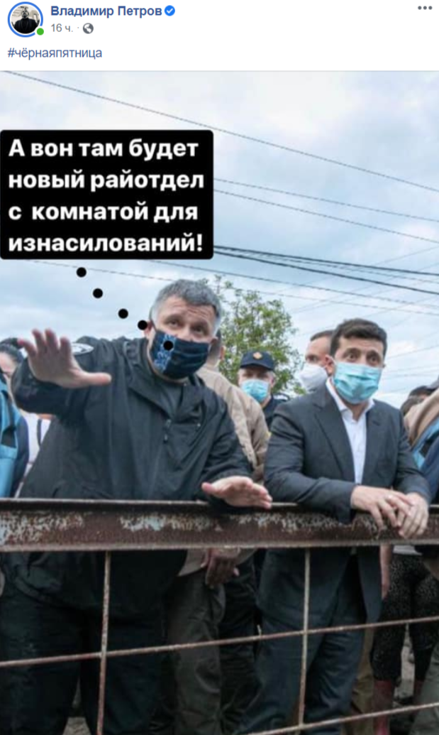 Телефедущий Владимир Петров публикует эту же фотографию с подписью: "А вот там будет новый райотдел с комнатой для изнасилований!", явно с отсылкой о деле полицейских, которые изнасиловали девушку в Кагарлыке.