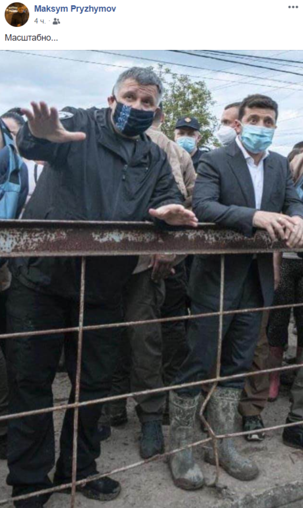 Как он это делает - видно на эпохальном фото, которое опубликовал министр. Аваков показывает куда-то вдаль, а президент стоит рядом в грязных резиновых сапогах и маске. Обращает на себя внимание удивленно-испуганный взгляд Зеленского.