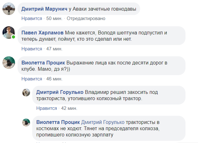 "Владимир решил закосить под тракториста, утопившего колхозный трактор", - развивает тему Дмитрий Горулько. На это Виолетта Процик отвечает, что "трактористы в костюмах не ходют. Тянет на председателя колхоза, пропившего колхозную зарплату".