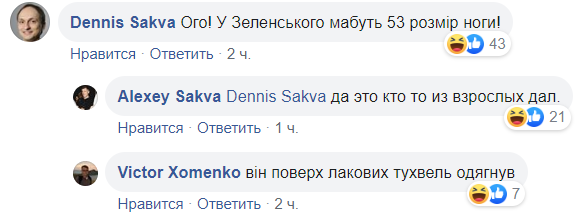 "Ого! У Зеленского наверное 53 размер ноги!", - пишет Денис Саква. "Да это кто-то из взрослых дал", - уверен Алексей Саква.