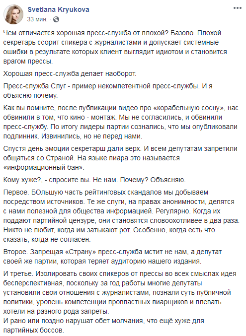 В свою очередь первый заместитель главного редактора "Страны" Светлана Крюкова отмечает, что пресс-служба "Слуги народа" неграмотно выстроила коммуникацию спикеров партии с журналистами.
