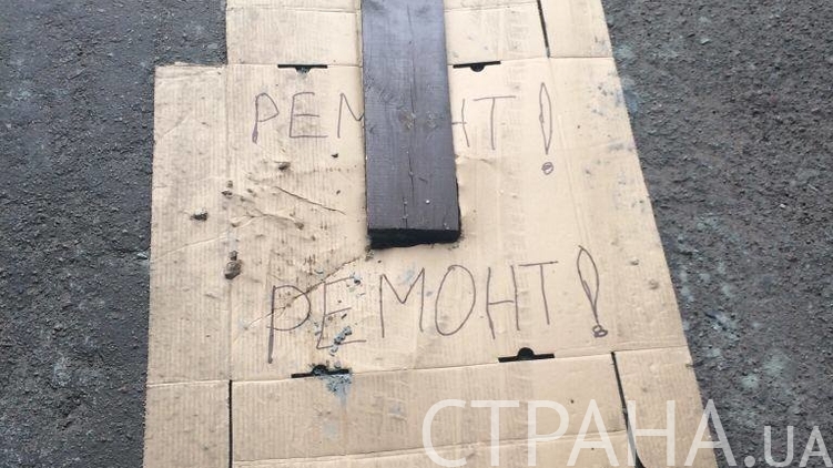 Убрать ямы полностью не удалось, однако, пока цемент сохнет, места "ремонта" обозначили картонками и палками: "Ремонт!" - написано на них.