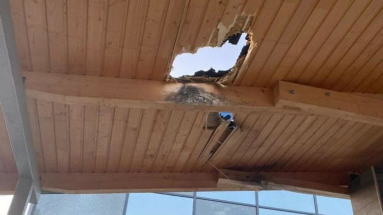 Предварительно сообщается о повреждении 7-9 стеклянных панелей самого здания и беседки. На одной из беседок на крыше застрял снаряд из РПГ, который не разорвался.
