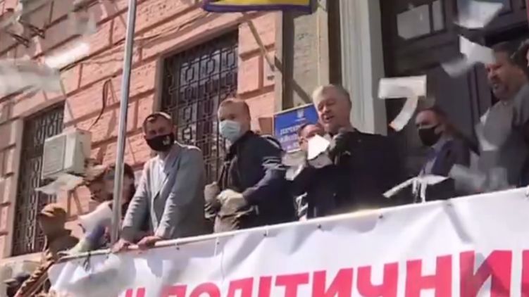 Во время речи Порошенко у Печерского суда в него бросили пачкой долларов. Видео