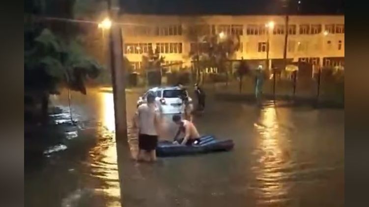 В Харькове после сильного ливня затопило улицы, в результате чего местные жители решили поплавать на надувной лодке.