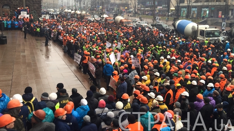Около полутора тысяч строителей протестовали у здания Киевской городской госадминистрации утром во вторник. Как передает корреспондент "Страны", вдоль Крещатика в районе КГГА стоят два десятка работающих бетономешалок. Водители за рулем спецтехники сигналят и вращают емкости для бетона, участники митинга стучат строительными касками и кричат "Ганьба".