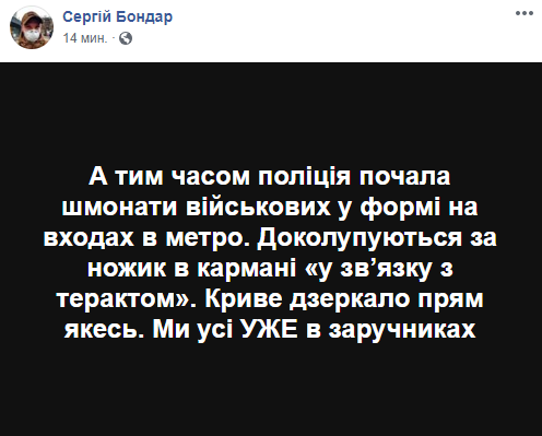 Полиция начала массово останавливать людей в военной форме. Об этом написал в Facebook глава киевской муниципальной стражи Сергей Бондарь.