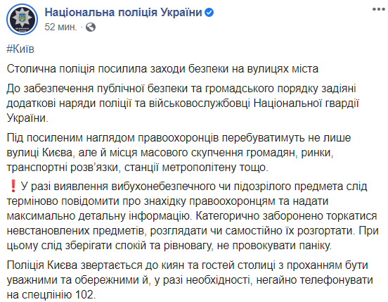 Однако, памятуя о взрыве на метро "Минская", в Киеве начали проверять людей в форме и вообще усилили меры безопасности. Полиция усилила патрулирование в местах скопления людей, на улицы вывел Нацгвардию.