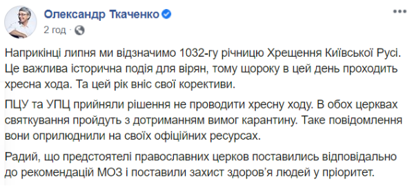"Рад, что предстоятели православных церквей отнеслись ответственно к рекомендациям Минздрава и поставили защиту здоровья людей в приоритет", - прокомментировал такое решение министр культуры и информационной политики Александр Ткаченко.