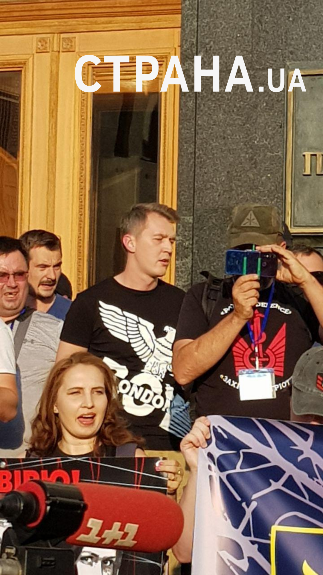 21:06 Активисты окружили оператора и журналиста телеканала "1+1" и начали скандировать "Ганьба".