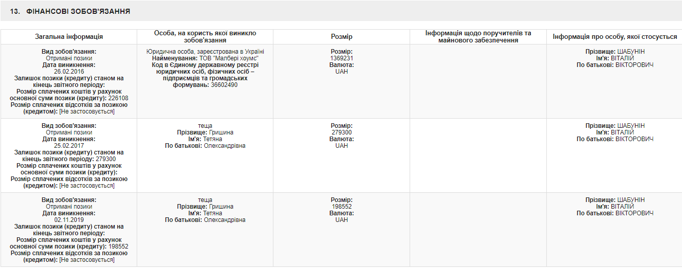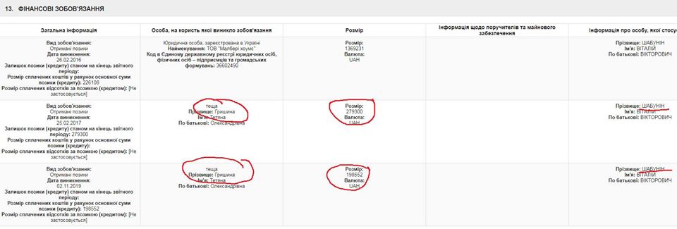 В декларации за 2019 год в разделе "Финансовые обязательства" указано, что в 2017 году он занял деньги у тещи Татьяны Гришиной - 279 330 грн, а в 2019 году занял у нее же 198 552 грн.