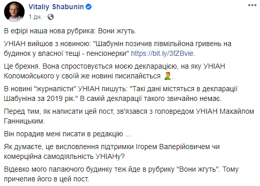 Перед тем, как написать этот пост, связался с главредом УНИАН Михаилом Ганницким. Он посоветовал мне писать в редакцию..." - написал Шабунин в Facebook.