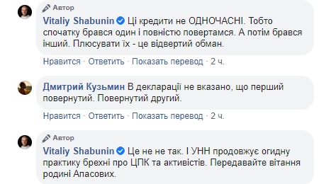Отвечая на похожие вопросы, в комментариях к своему посту о том, что СМИ солгали, сам Шабунин все-таки подтвердил наличие двух заемов у тещи на общую сумму почти полмиллиона гривен.