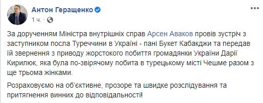 "По поручению Министра внутренних дел Арсена Авакова провел встречу с заместителем посла Турции в Украине - госпожой Букет Кабакджы и передал ей обращение по поводу жестокого избиения гражданки Украины Дарьи Кирилюк, которая была зверски избита в турецком городе Чешме вместе с еще тремя женщинами.