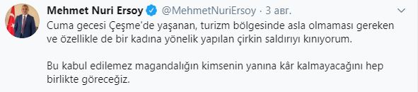 Отреагировали на это и в Турции. "Я осуждаю ужасное нападение в Чешме. Этого не должно быть в туристическом районе, особенно в отношении женщины", - написал в Твиттере министр культуры и туризма Турции Мехмет Нури Эрсой.