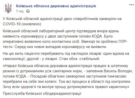 "Киевский областной лабораторный центр подтвердил вчера днем ​​наличие коронавируса у двух заместителей главы КОГА. Был оперативно выяснен круг контактных лиц. Вечером им сделаны ПЦР-тесты. Среди них новых случаев коронавируса не обнаружили", - говорится в сообщении.