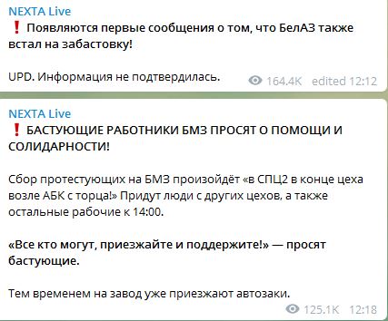 12:24 Телеграм-канал NEXTA сообщил, что Белорусский металлургический завод начал забастовку. Правда, позже уточнил, что информация не подтвердилась. Однако якобы рабочие планируют ее провести к 14:00.