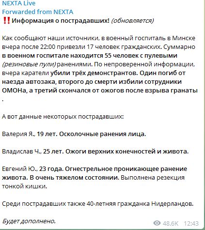10:37 Глава НСЖУ Сергей Томиленко сообщает со ссылкой на данные Associated Press, что во время разгона протестных демонстраций в Минске в ночь на 10 августа, силовики избили украинца Мстислава Чернова.