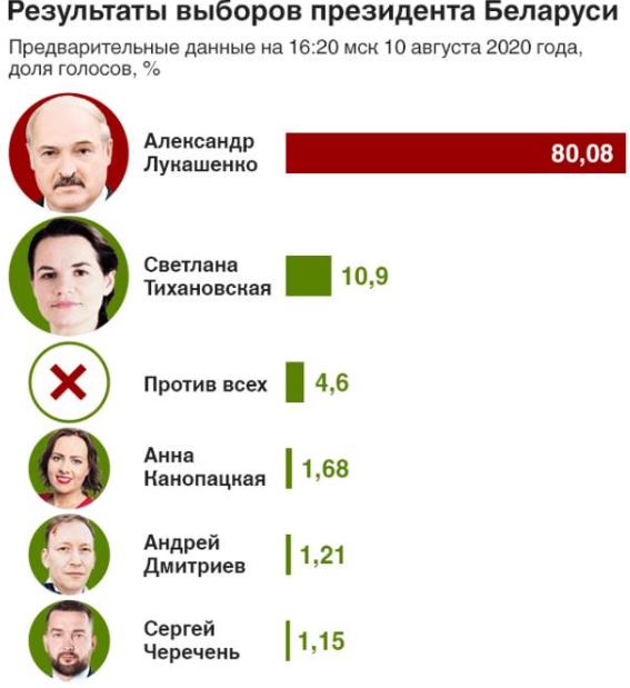 9:07 В голосовании на выборах президента Белоруссии приняли участие 5 млн 790 тысяч человек, явка составила 84,23%. Лукашенко по предварительным итогам набирает 80,23% голосов, Тихановская - 9,9%, сообщила глава ЦИК Белоруссии во время пресс-конференции.
