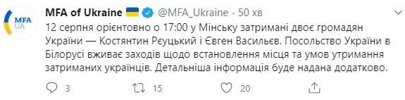 20:41 МИД Украины подтвердил информации о задержании в Минске граждан Украины Константина Реуцкого и Евгения Васильева. Ведомство устанавливает их место нахождения.