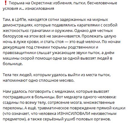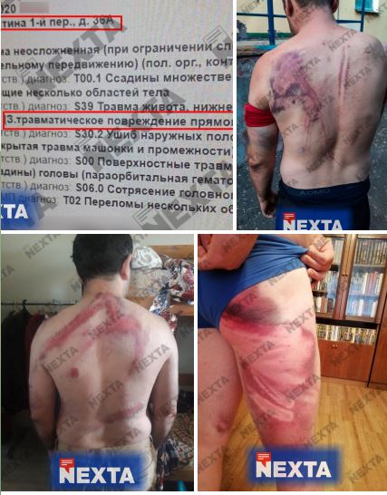 20:23 Тем временем телеграм-канал Nexta live публикует фото с подписью, что такие травмы получил один из задержанных в Минске, который находился на Окрестина (Центр изоляции правонарушителей). Как пишет Nexta, в медкарте зафиксированы: ссадины по всему телу, сотрясение мозга, множественные переломы, травматическое повреждение прямой кишки (что означает, что человека изнасиловали).
