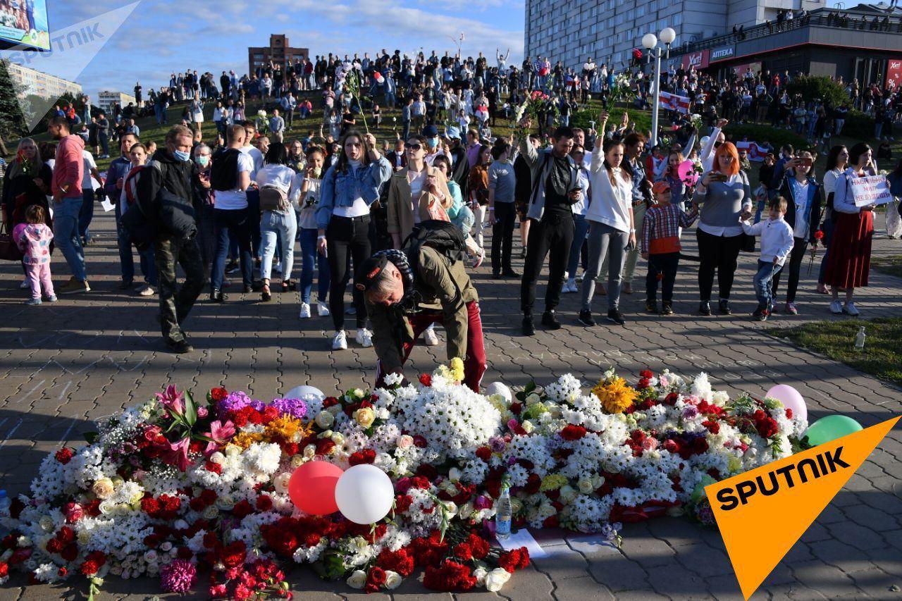 19:38 Минск. К месту гибели демонстранта несут цветы и лампады.