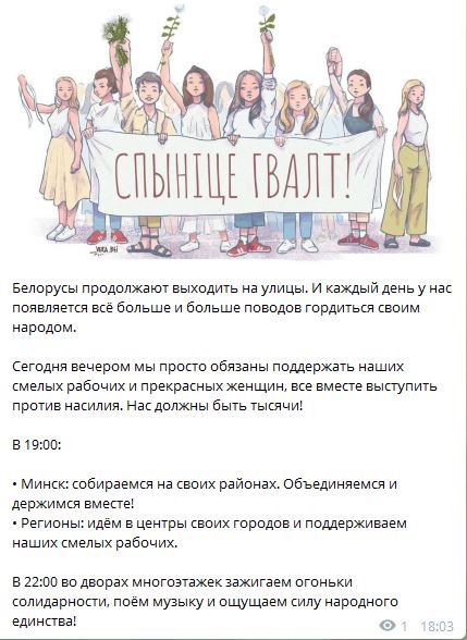 Программа на сегодня была такая: в 19:00 жители Минска выйдут на улицы в своих районах, в регионах собрания в центре городов. Там после смены обещали вывести на улицы рабочих. В 22:00 во дворах многоэтажек должны были зажечь огоньки солидарности и петь. Об этом написали в оппозиционных телеграм-каналах.