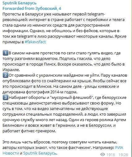 19:43 МИА "Россия сегодня" в телеграм-канале свой пресс-службы "Зубовский, 4" перечислила некоторые фейки "белорусской телеграм-революции".