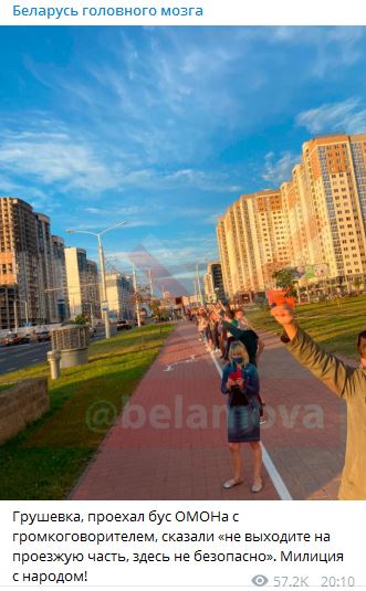 20:17 Минск. "Грушевка, проехал бус ОМОНа с громкоговорителем, сказали "не выходите на проезжую часть, здесь не безопасно". Милиция с народом!" - пишет телеграм-канал "Беларусь головного мозга".