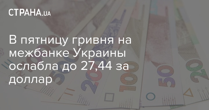 В пятницу, 21 августа, на межбанковском валютном рынке гривня ослабла до 27,4450 грн/$1 с 27,3675 грн/$1 в предыдущий рабочий день. Котировки нацвалюты на закрытии торгов составили 27,43-27,46 грн/$1. Об этом сообщает "Интерфакс-Украина" со ссылкой на дилеров коммерческих банков.