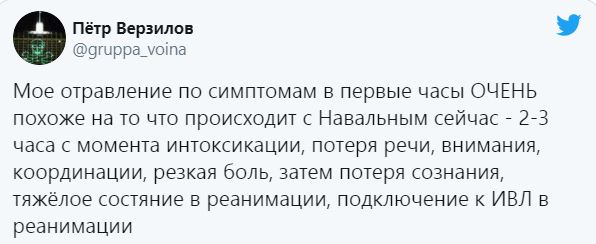 Петр Верзилов уже написал в Twitter, что его случай очень похож на ситуацию с Навальным.
