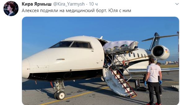 Пресс-секретарь политика Кира Ярмыш опубликовала фото, как Алексея Навального подняли на медицинский борт. Вместе с ним вылетела его жена.