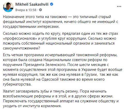 "Назначение этого типа на таможню — это типичный старый феодальный институт кормления, ничего общего не имеющий с государственными интересами", - написал Саакашвили.