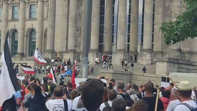 Участники протестов штурмуют здание Рейхстага. Скриншот из видео