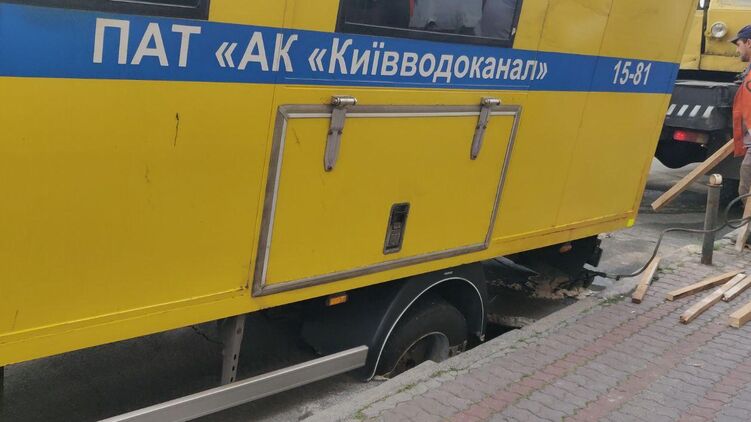 В Киеве на Подоле провалилась в асфальт машина "Водоканала". Фото