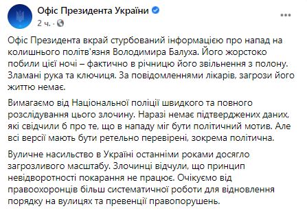 "Офис Президента крайне обеспокоен информацией о нападении на бывшего политзаключенного Владимира Балуха. Его жестоко избили ночью - фактически в годовщину его освобождения из плена. Сломанные рука и ключица. По сообщениям врачей, угрозы его жизни нет.