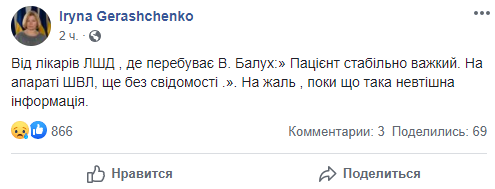 Об состоянии Балуха сообщает на свое личной странице в Facebook народный депутат Ирина Геращенко.