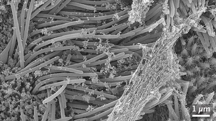 Инфицированная ресничная клетка с нитями слизи, прикрепленными к кончикам ресничек. Фото: nejm.org