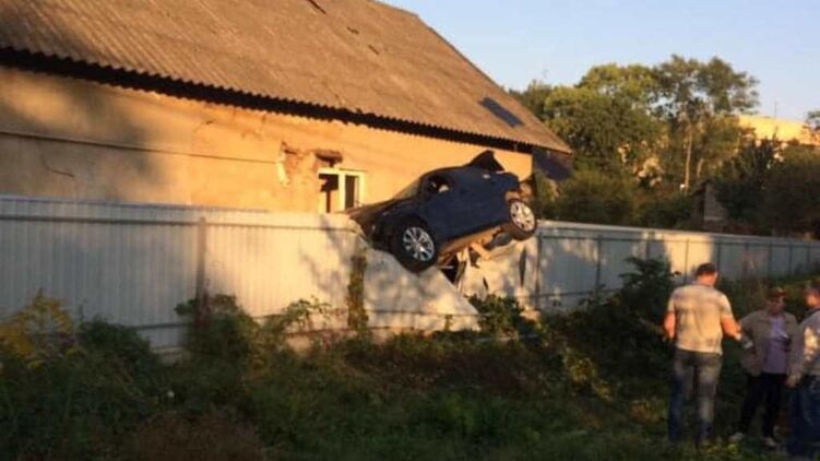 Машина сотрудника полиции повисла на заборе в результате ДТП. Фото: УНИАН