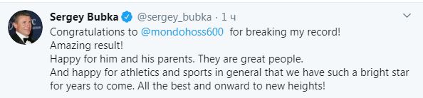 "Поздравляю с побитием моего рекорда! Потрясающий результат!" – написал Бубка в твиттере.