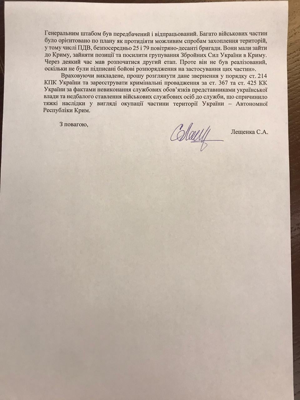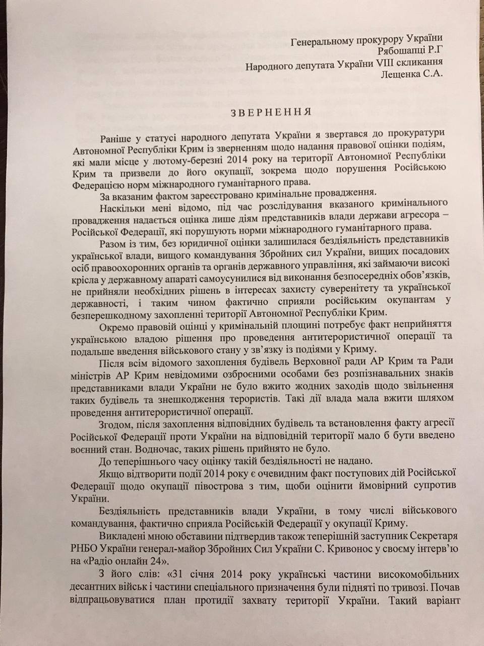 Лещенко еще в январе требовал проверить, почему власти Украины зимой-весной 2014 года не ввели в Крыму ни антитеррористической операции, ни военного положения. И не является ли это с их стороны преступлением.