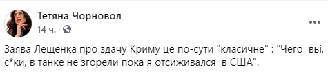 Экс-депутат "Народного фронта" Татьяна Черновол: "Заявление Лещенко о сдаче Крыма это по-сути "классическое": "Чего вы, с * ки, в танке не сгорели пока я отсиживался в США".