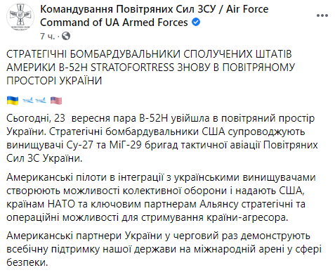 Зато на учениях в Украине снова побывали ядерные бомбардировщики США, о чем отчиталось командование ВВС Украины (о них мы еще скажем ниже).
