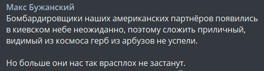 "Бомбардировщики наших американских партнёров появились в киевском небе неожиданно, поэтому сложить приличный, видимый из космоса герб из арбузов не успели.