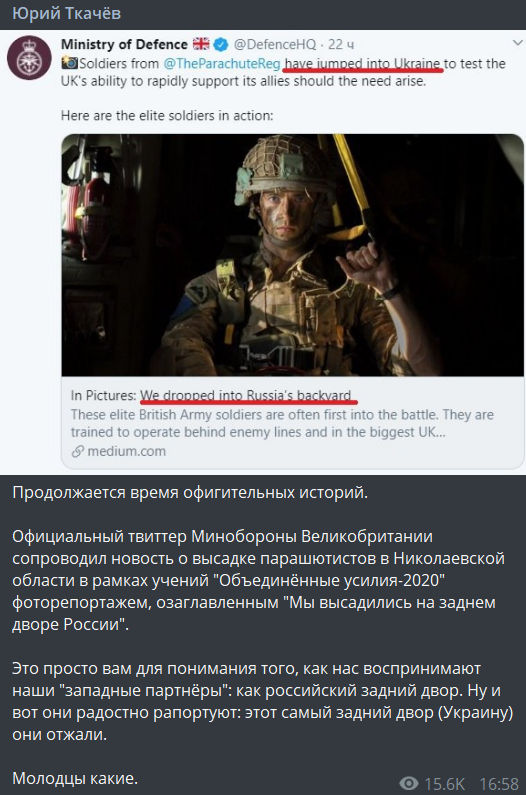 Правда, украинцы здесь рассматривались изначально как статисты. Британское минобороны сделало оговорку по Фрейду, заявив, что сегодня его парашютисты высадились на "заднем дворе России". Хотя по факту это была Николаевская область.