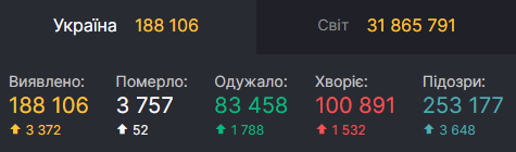 В Украине по состоянию на утро четверга, 24 сентября, зафиксировано 3 372 новых случая заражения Covid-19. Таким образом, общее число зараженных выросло в стране до отметки в 188 106 человек.