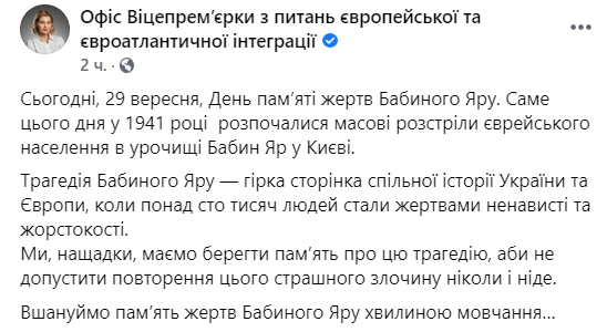 "Сегодня мы чтим память жертв трагедии Бабьего Яра. Невинные жизни оборвались в результате преступных и безжалостных действий нацистского режима. Масштабы этого бедствия до сих пор являются болью не только для Украины, но и для всего мира", - говорится на сайте парламента.
