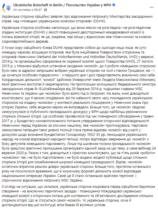 В день проведения вебинара с Касьяновым - 24 сентября - украинский МИД отказался от патроната над совместной исторической комиссией.
